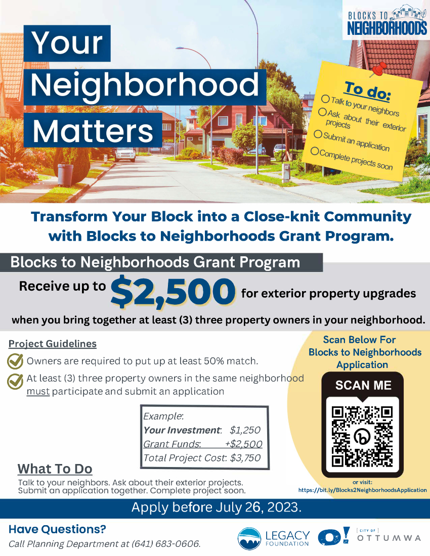 CITY OF OTTUMWA EXTENDS BLOCKS TO NEIGHBORHOODS PROGRAM DEADLINE TO JULY 26, 2023