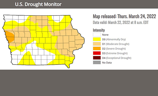 The new map from the U.S. Drought Monitor shows soil conditions in Iowa are improving, slightly, thanks to rain and snow in the past week.
